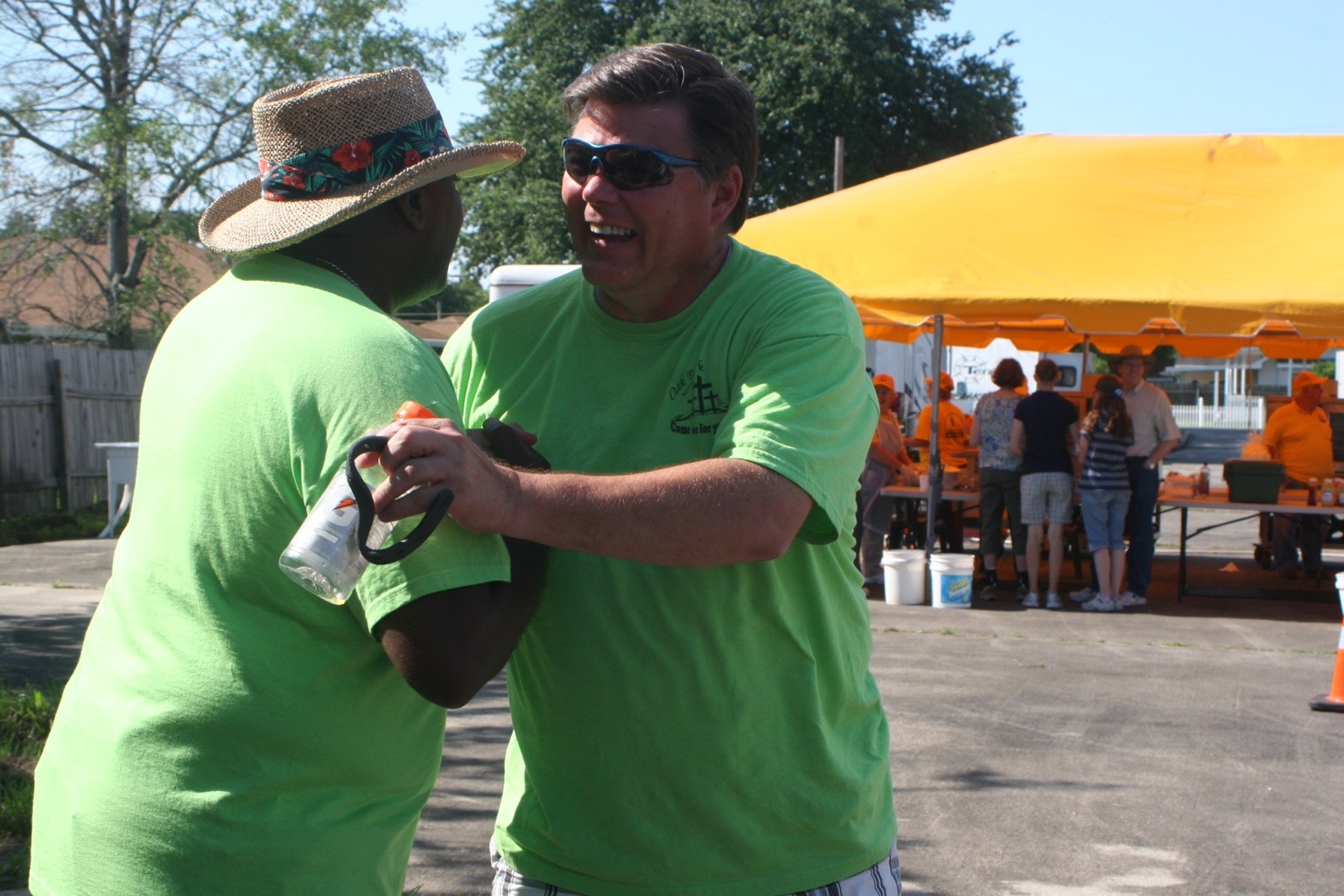 Pastor Bobbby Stults (right) greets K.C. Leonard, a member of his church, during their Crossover block party June 16.
