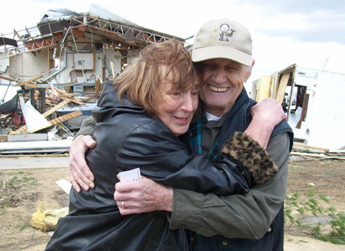 Raymond and Betty Kramer hug each other after being interviewed by the media about their experience in a Rochelle, IL restaurant’s storm cellar while a tornado was on the ground above them. This photo was taken n the town of Fairdale, IL, which was completely destroyed by tornado April 9.