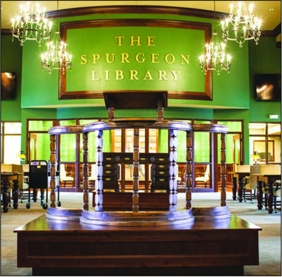 The historic podium anchors the new Spurgeon Library at Midwestern Baptist Theological Seminary, along with a collection of 5,103 of the great master’s books and commentaries from his pastoral office. Overhead hang large new paintings depicting the great preacher’s call and ministry. (We also saw Spurgeon’s doorknob and the silver keyhole cover from his study door, recently acquired.)