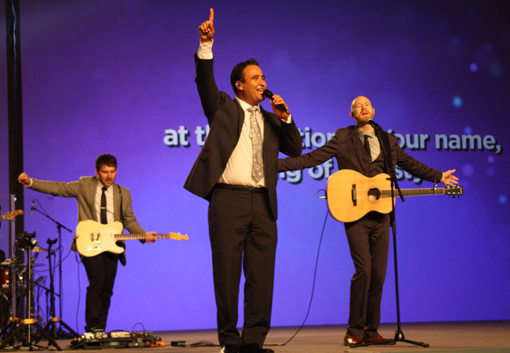 Pastors of different ethnicities led in prayer for racial reconciliation, and people gathered in small groups, standing shoulder-to-shoulder or hand-in-hand as they prayed for true unity. The church leaders then worshiped together on the stage, as the band led those in the packed auditorium to sing, “I am redeemed. You set me free.”